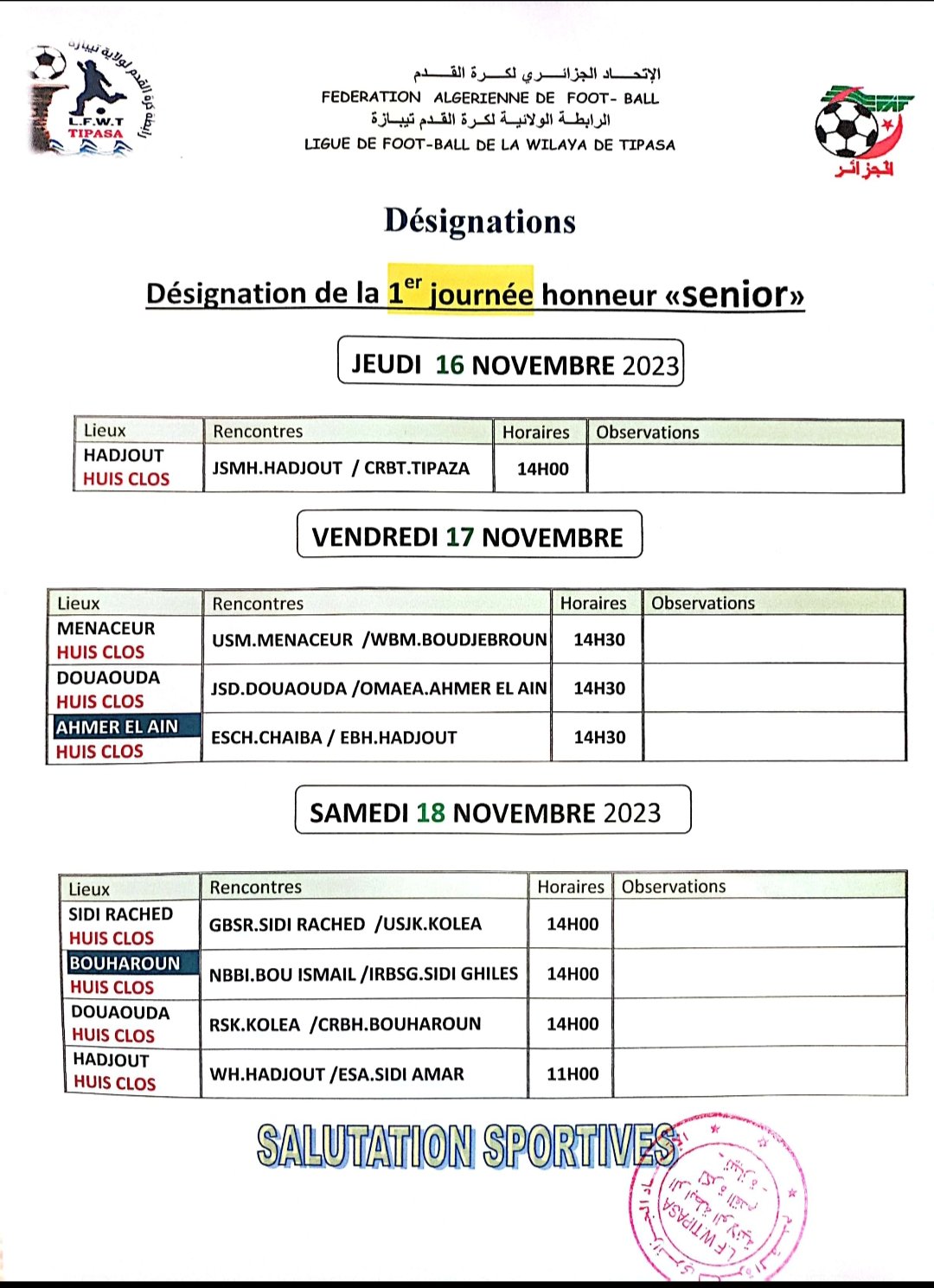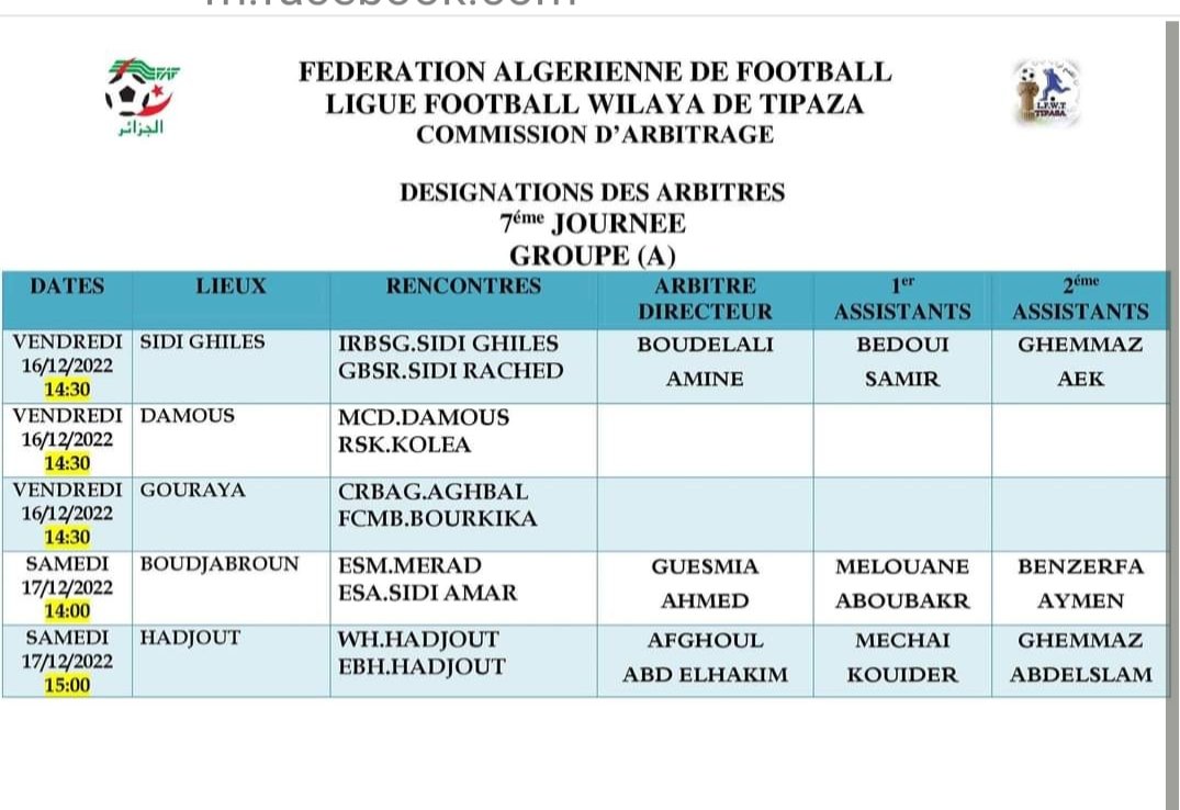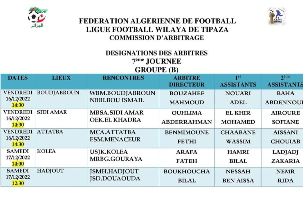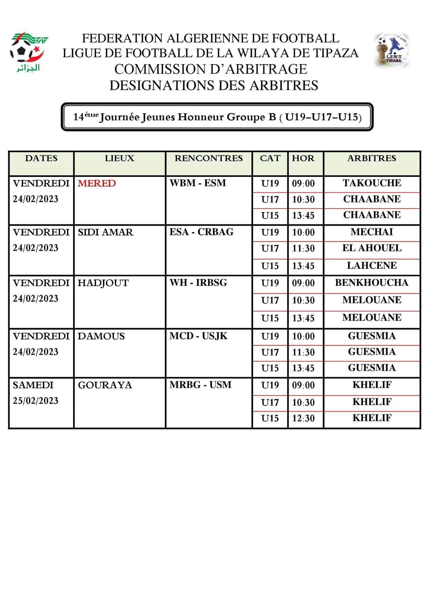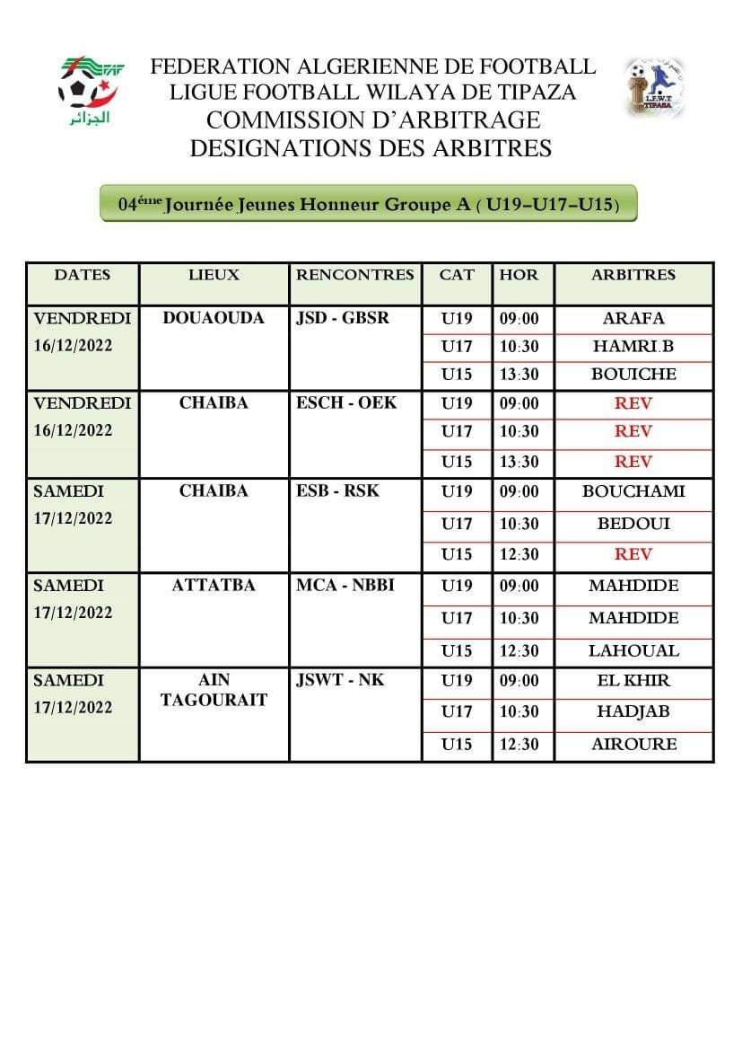 désignation des arbitres du 27.12.20222 Honneur + Jeunes